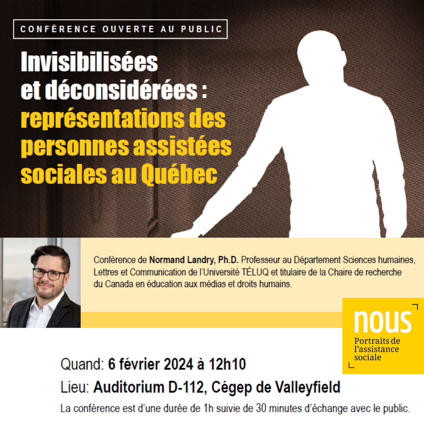 Le 16 février 2024, joignez-vous à notre table ronde engagée sur le thème « Le droit à l’amour à l’aide sociale ». Nos panélistes, Pierre Cardinal et Robert Roussel, apporteront leur expertise vécue, accompagnés de Jessica, membre de l’ADDS Huntingdon, et de deux représentantes du Comité femmes du Front commun des personnes assistées sociales du Québec. D’autres représentants d’organismes communautaires locaux se joindront également à la discussion, créant une plateforme riche en échanges avec l’assistance. L’entrée est gratuite, mais une inscription préalable est nécessaire pour participer. Profitez de l’occasion pour partager vos perspectives et découvrez la diversité des expériences liées à l’aide sociale. Une collation sera servie pour favoriser la convivialité. Le programme détaillé commence par un accueil à 13h30, suivi d’un mot d’introduction à 13h45. La table ronde débutera à 14h, suivie d’une session d’échanges avec l’assistance et d’une collation à 14h45. Enfin, à 15h15, plongez dans une visite commentée de l’exposition qui suscitera la réflexion sur les thèmes abordés. Nous anticipons une discussion enrichissante et espérons vous accueillir nombreux pour cet événement significatif.